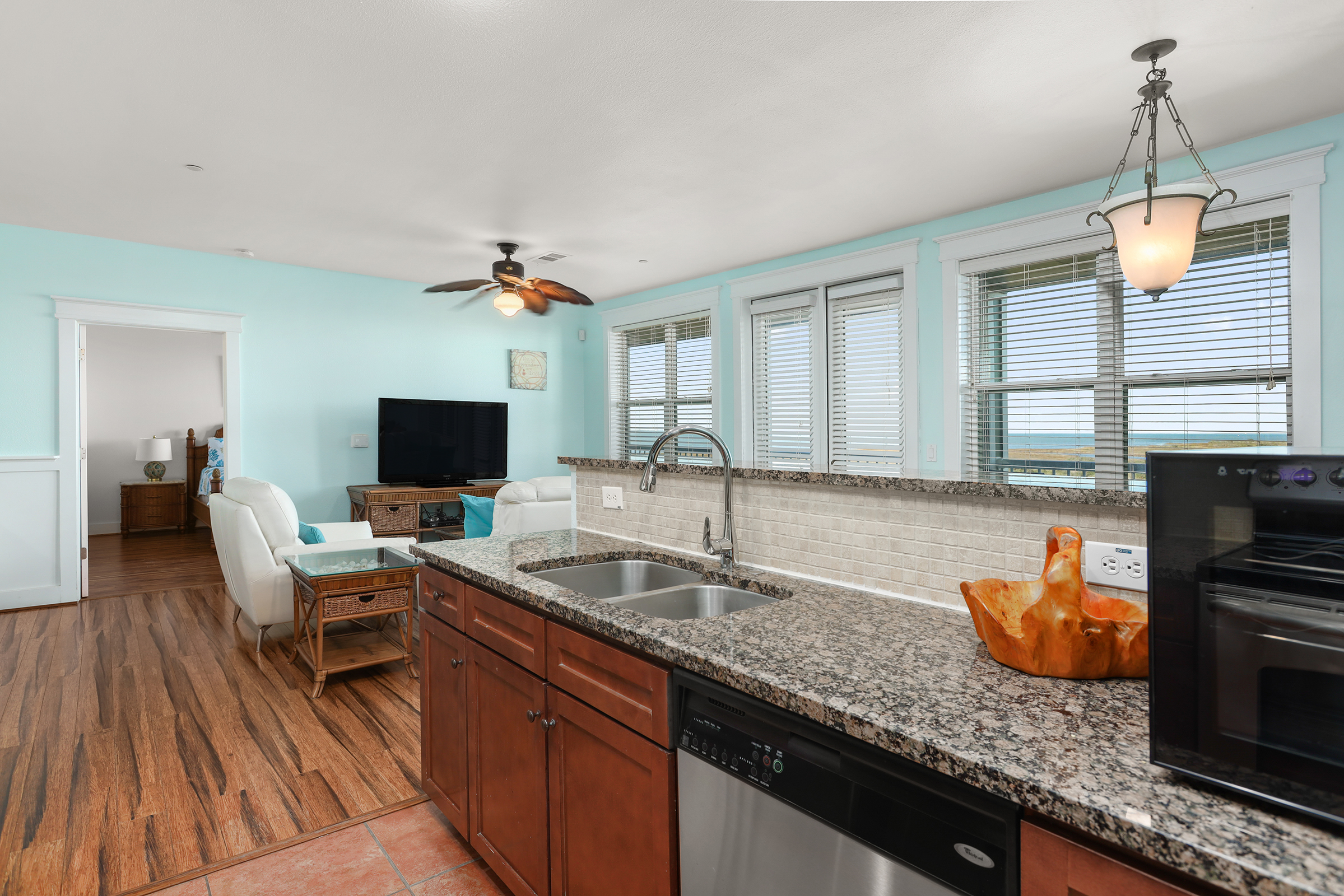 Second floor unit with amazing views of Galveston’s West Bay. Sunsets are spectacular from the large comfortable balcony. Fishing, paddle boarding, kayaking are steps away from this unit. A short drive across the street are the inviting large beaches of the Pointe West Community.