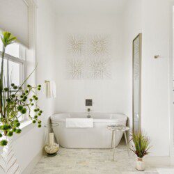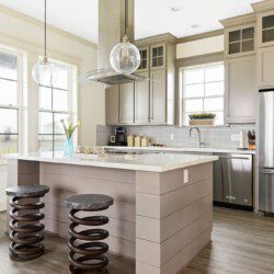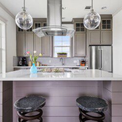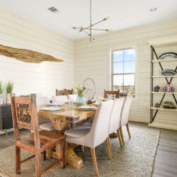 Whimsical touches, like barstools sitting atop giant springs or rare driftwood hanging on wall, paired with natural materials help create the perfect “at-the-beach” vibe without the kitsch.