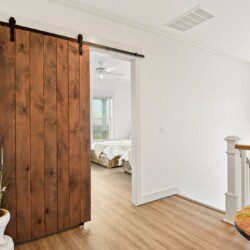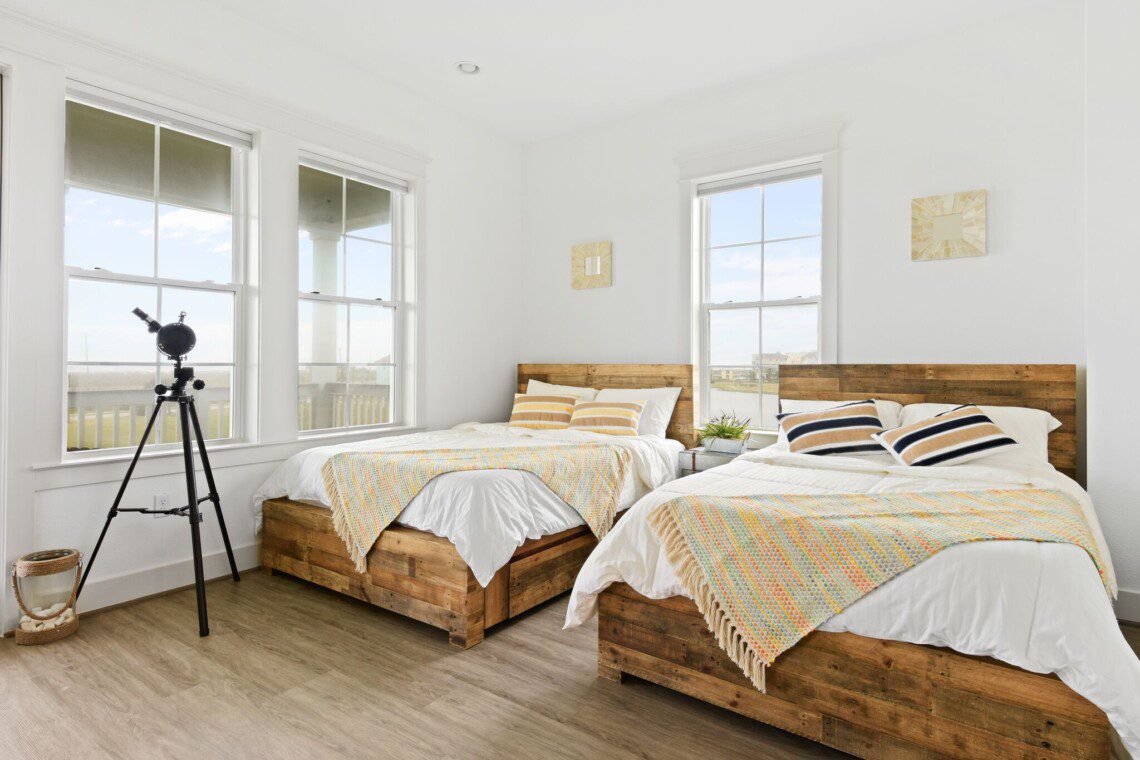 On the second floor, two guest rooms (one with a queen and a full bed and another with a king) share a furnished balcony.